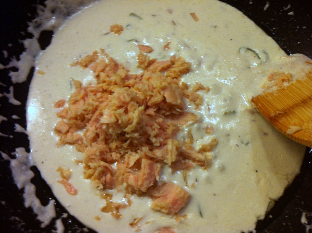 Just one minute before you drain the farfalle, add the tuna in the sauce.