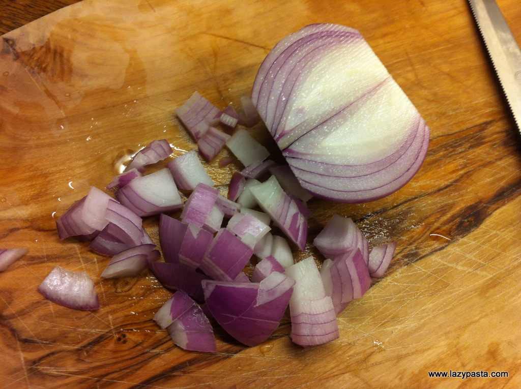 Finely chop the onion, which is going to add up to the rather sweet taste of this dish.