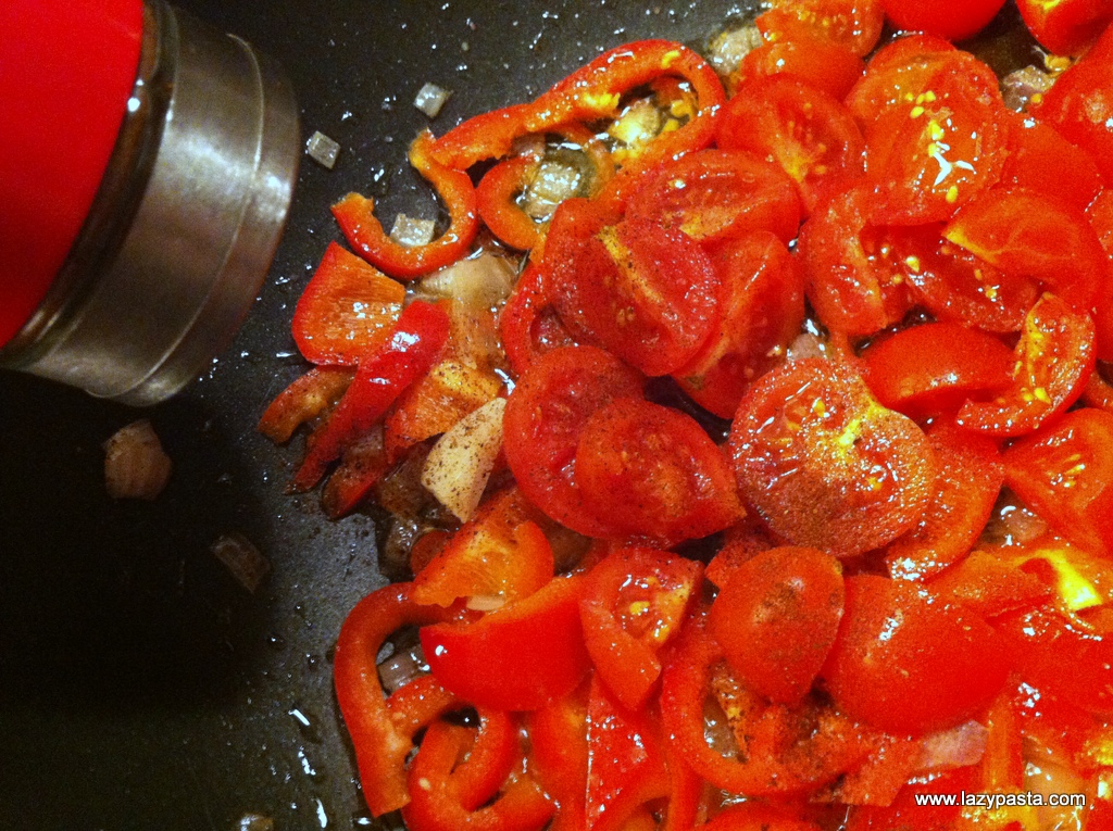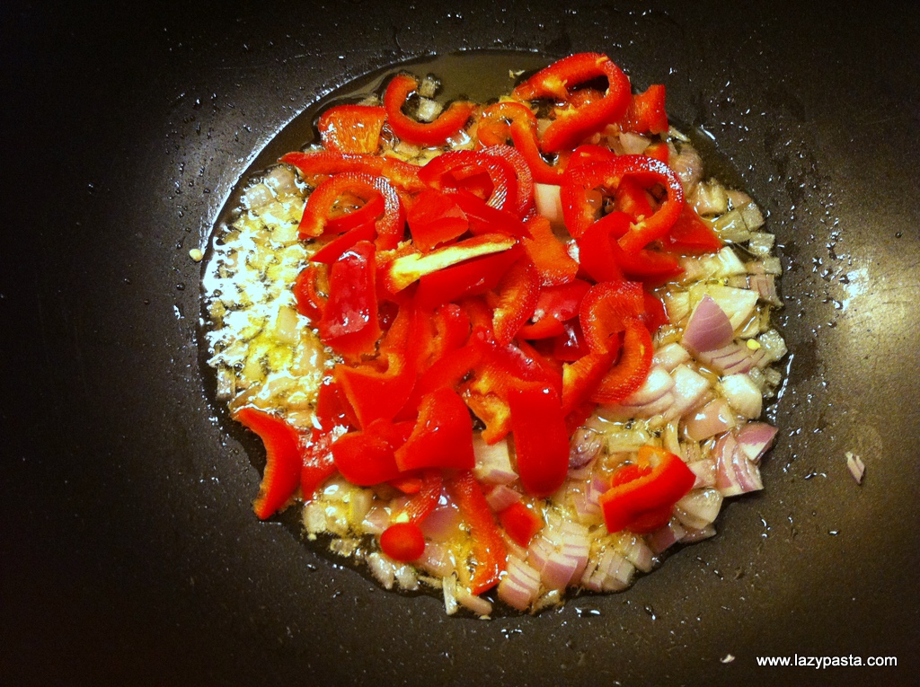 Slice the red pepper either in rings or in smaller pieces and add them to the pan.