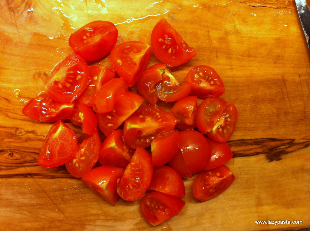 Cut the cherry tomatoes in quarters -some might prefer them in halves as well.