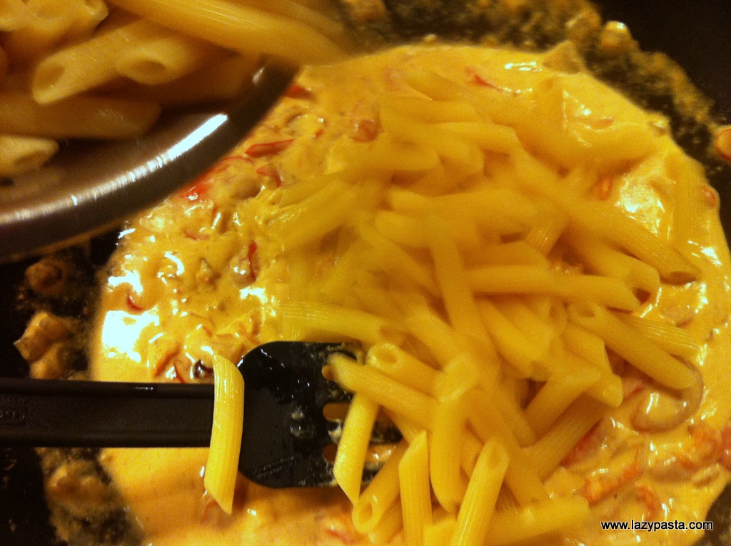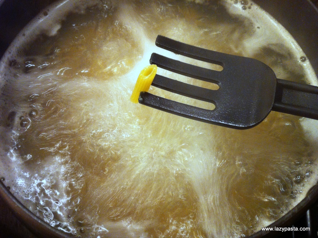 Start boiling the penne in salted water for one minute less than indicated on the package.